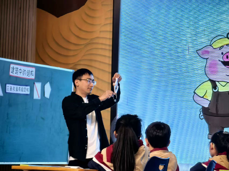 紧接着,龙湾的陈健老师与 301 班的同学们携手呈现了《形状与结构》一课。陈老师以经典的 “三只小猪建房子” 故事为情境主线,瞬间抓住了学生们的注意力。课堂上,陈老师引导学生思考不同材质、不同形状的房子为何稳固性不同,进而让学生动手研究不同形状在建筑结构中的稳固性。原本抽象难懂的结构知识,在充满童趣的故事与生动的实验中变得浅显易懂,极大地激发了学生的学习兴趣,让学生在玩中学、学中思,真正实现了知识的有效传递。